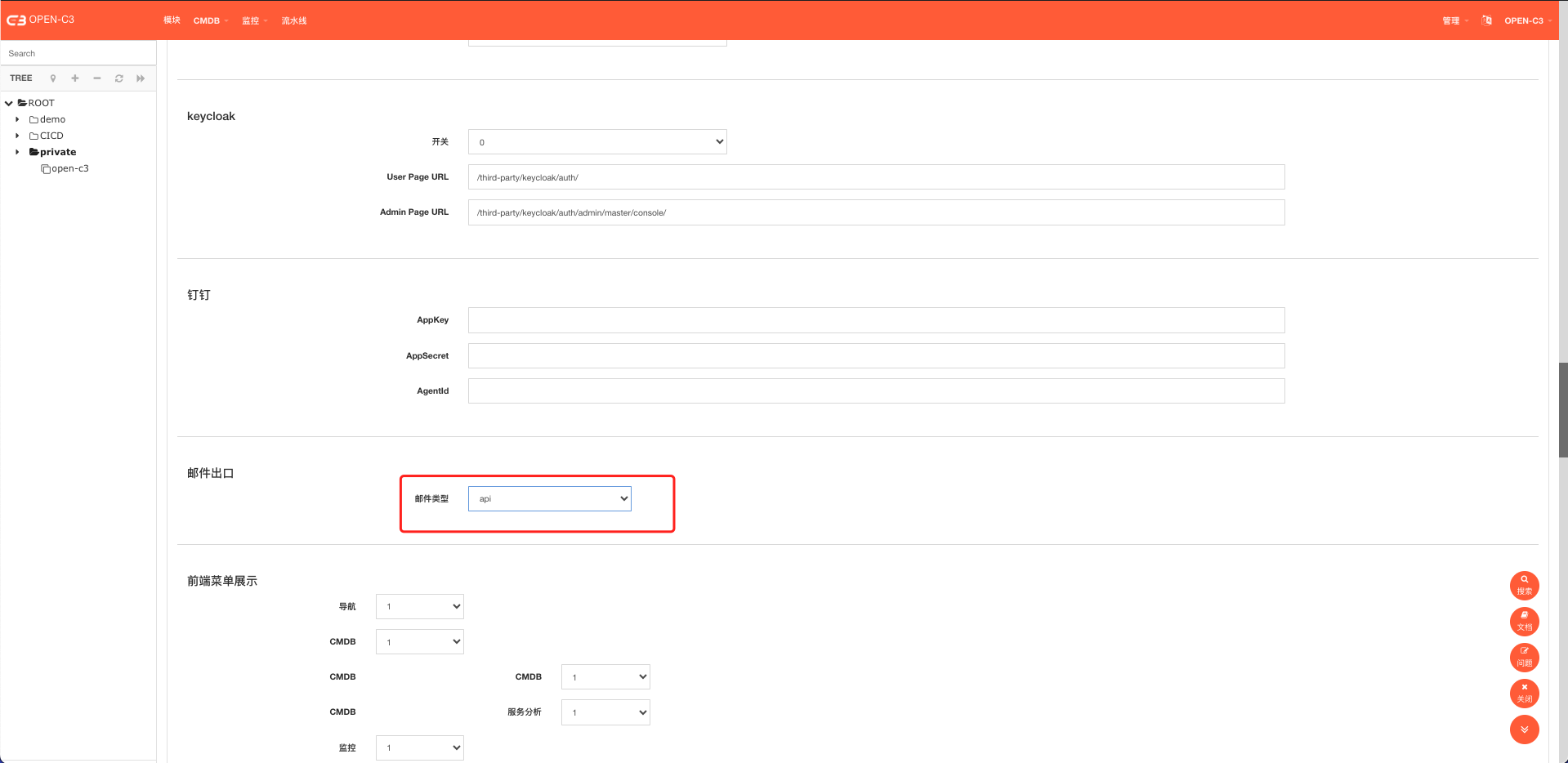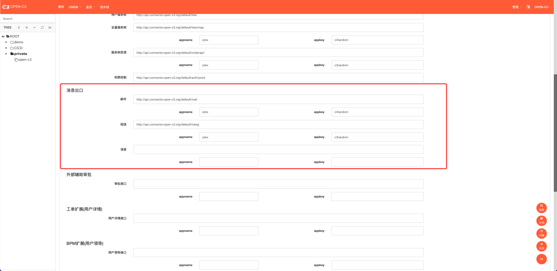Open-C3可能会对外发送三种消息。邮件、短信、语音。其中邮件有统一性,所有在系统参数中,可以选择smtp的方式也可以选择API的方式。短信和语音只能是API方式。