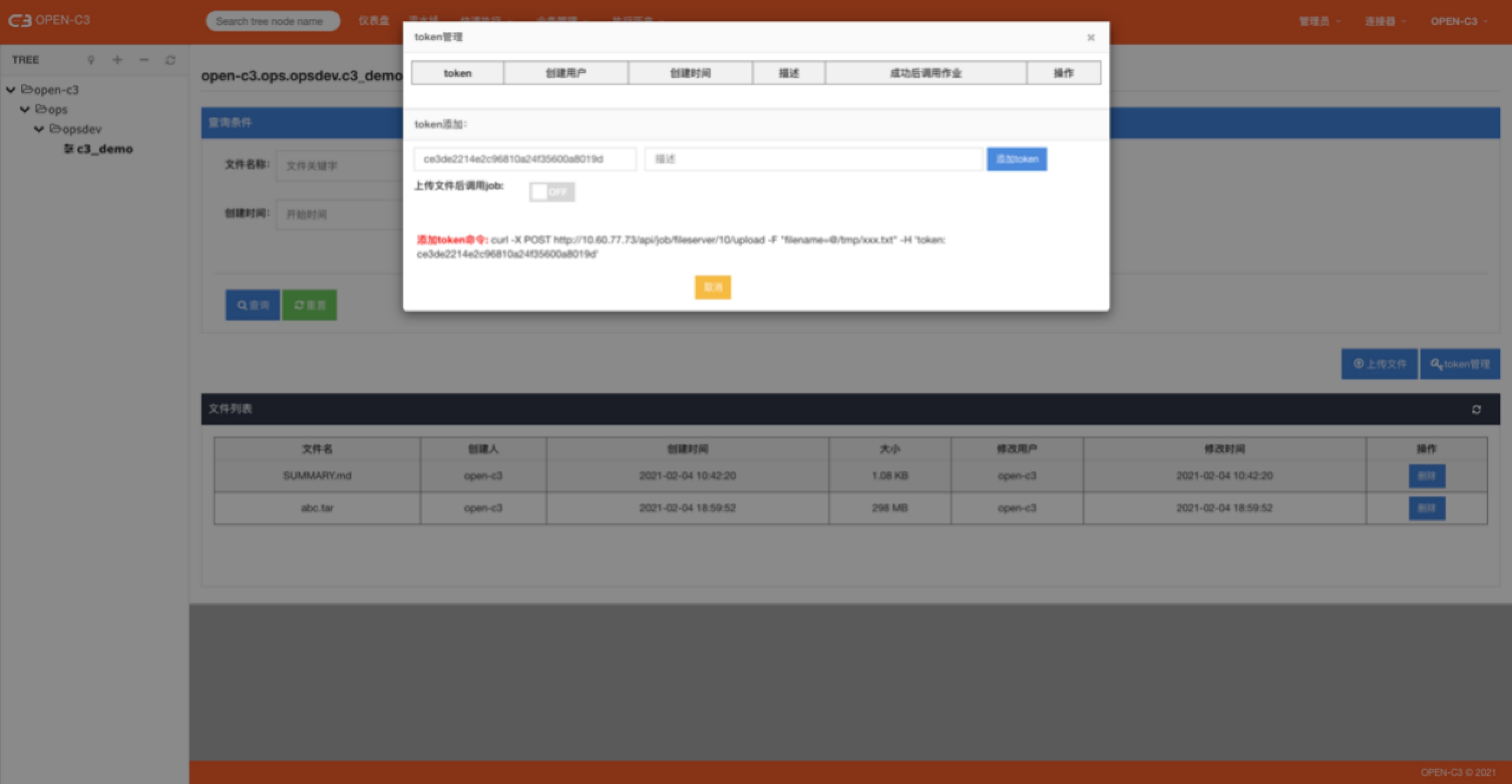 curl -X POST http://OPEN-C3地址/api/job/fileserver/服务树节点ID/upload -F "filename=@/tmp/xxx.txt" -H 'token: 申请的TOKEN'