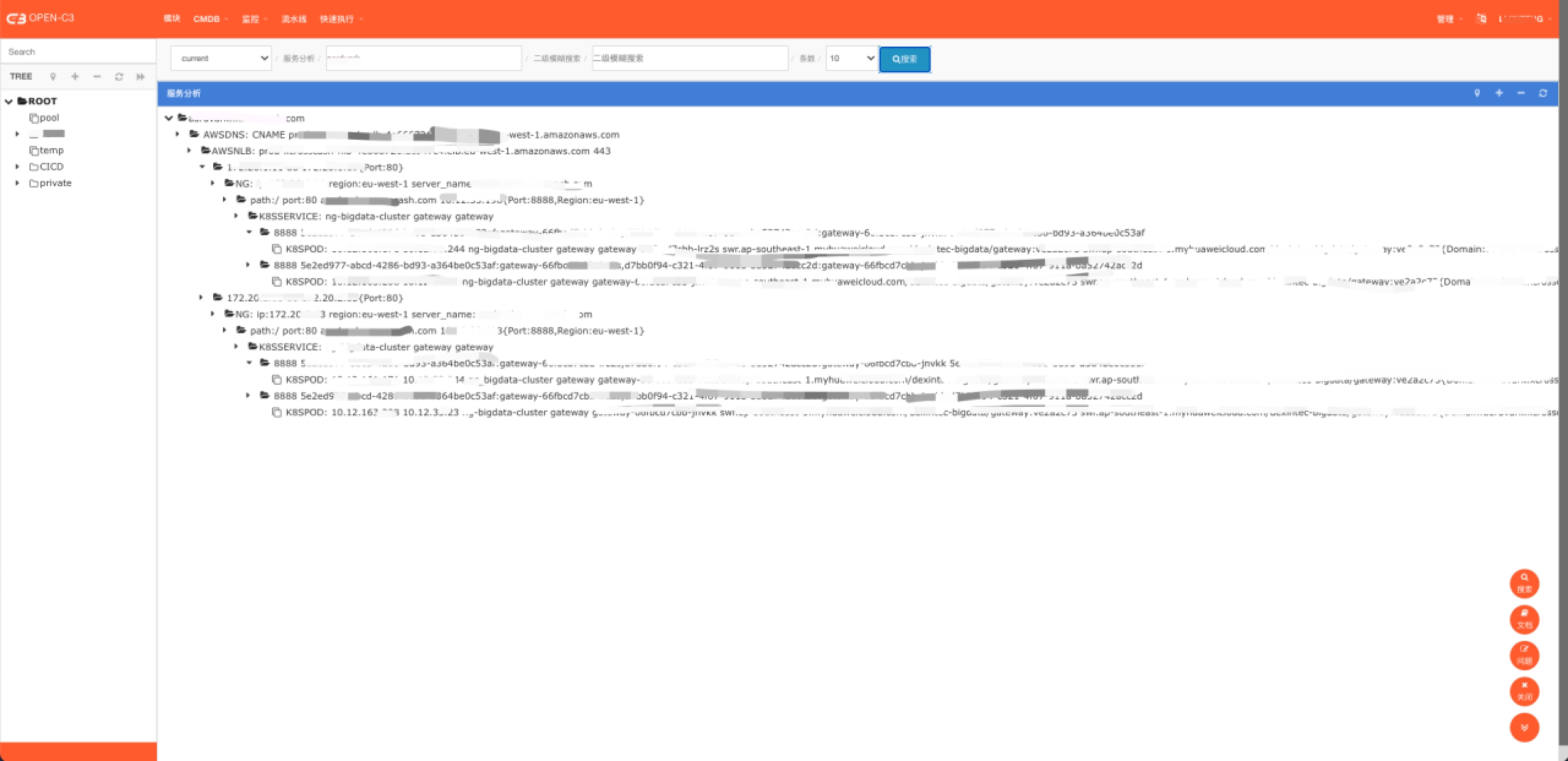有的企业业务模块很多,在业务出现问题时,为了方便运维或者值班人员快速了解业务的上下层级结构。Open-C3根据CMDB中的信息,生成了一个树形结构。从这个结构可以看到域名下面是那个负载均衡器,负载均衡器下面是什么资源、等等。