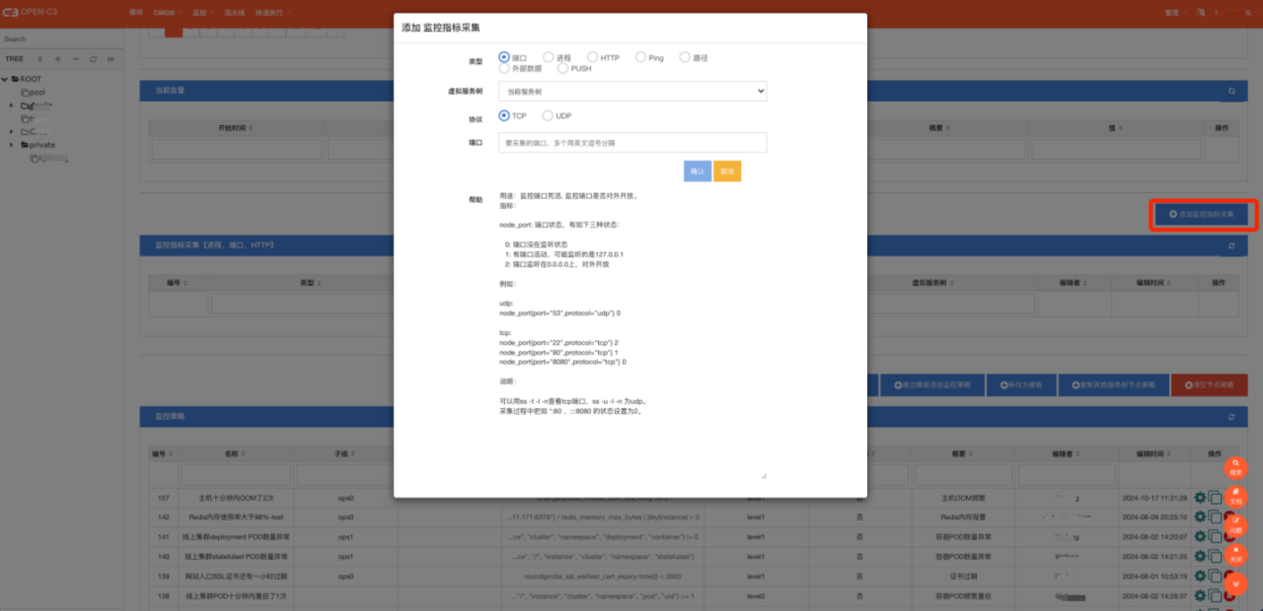 如下图,在监控告警配置页面,点击“添加监控指标采集”的按钮,可以看到关于端口、监控等监控的配置方式。可以根据页面中的帮助内容查看具体用法。