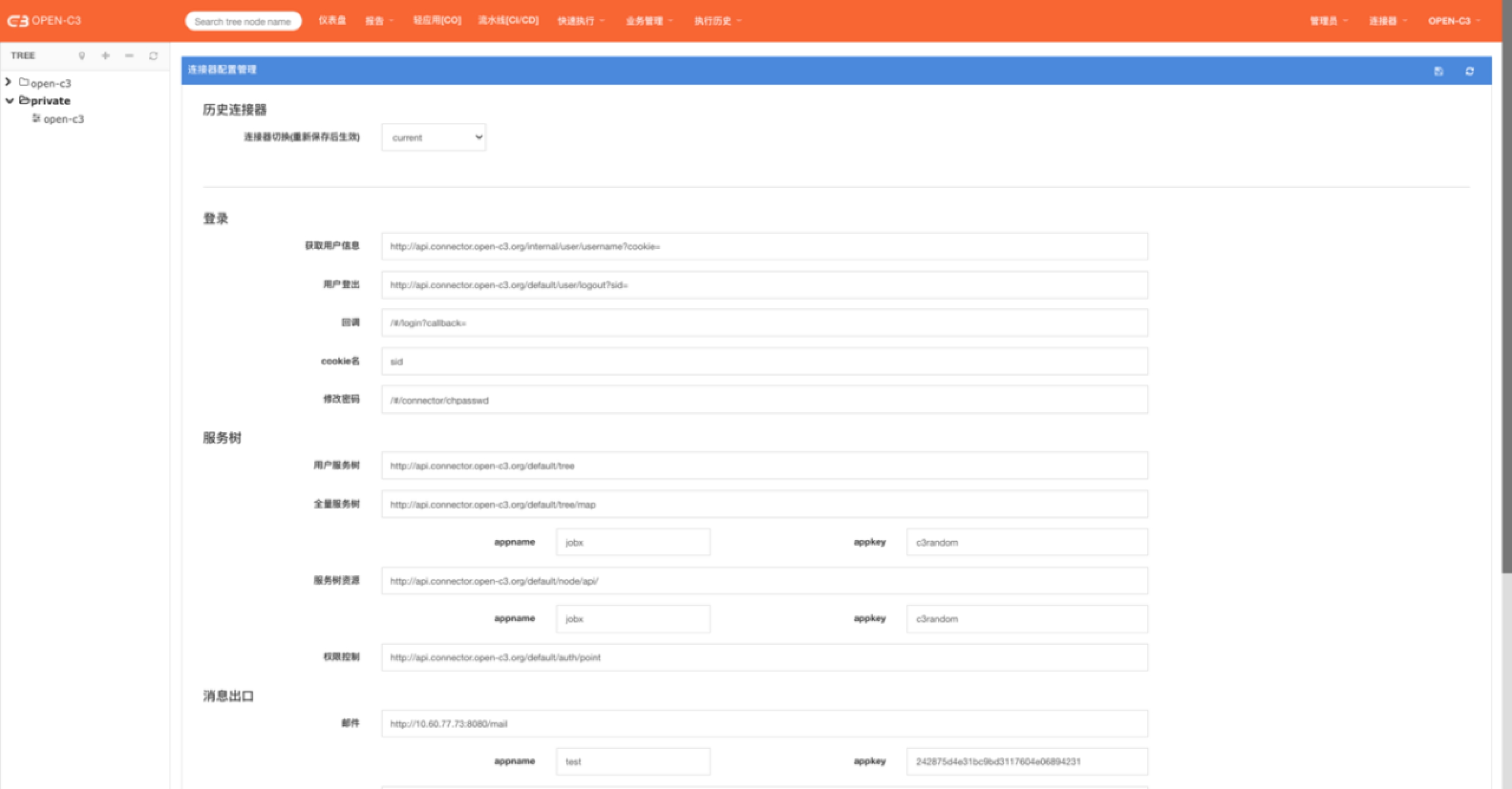 OPEN-C3允许通过连接器把登录,权限,服务树,消息出口对接到企业内部系统。