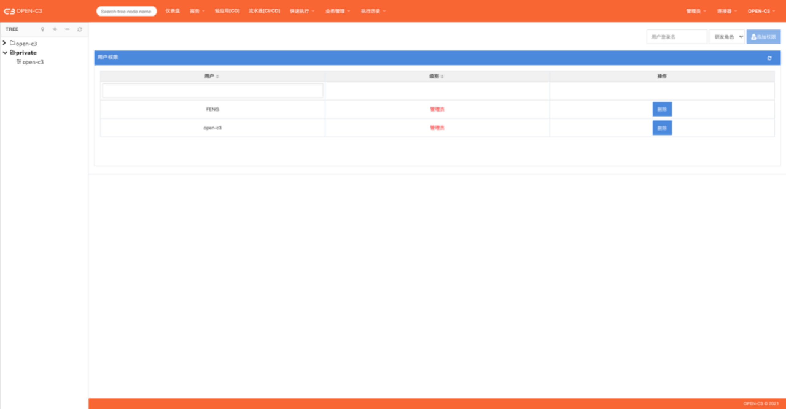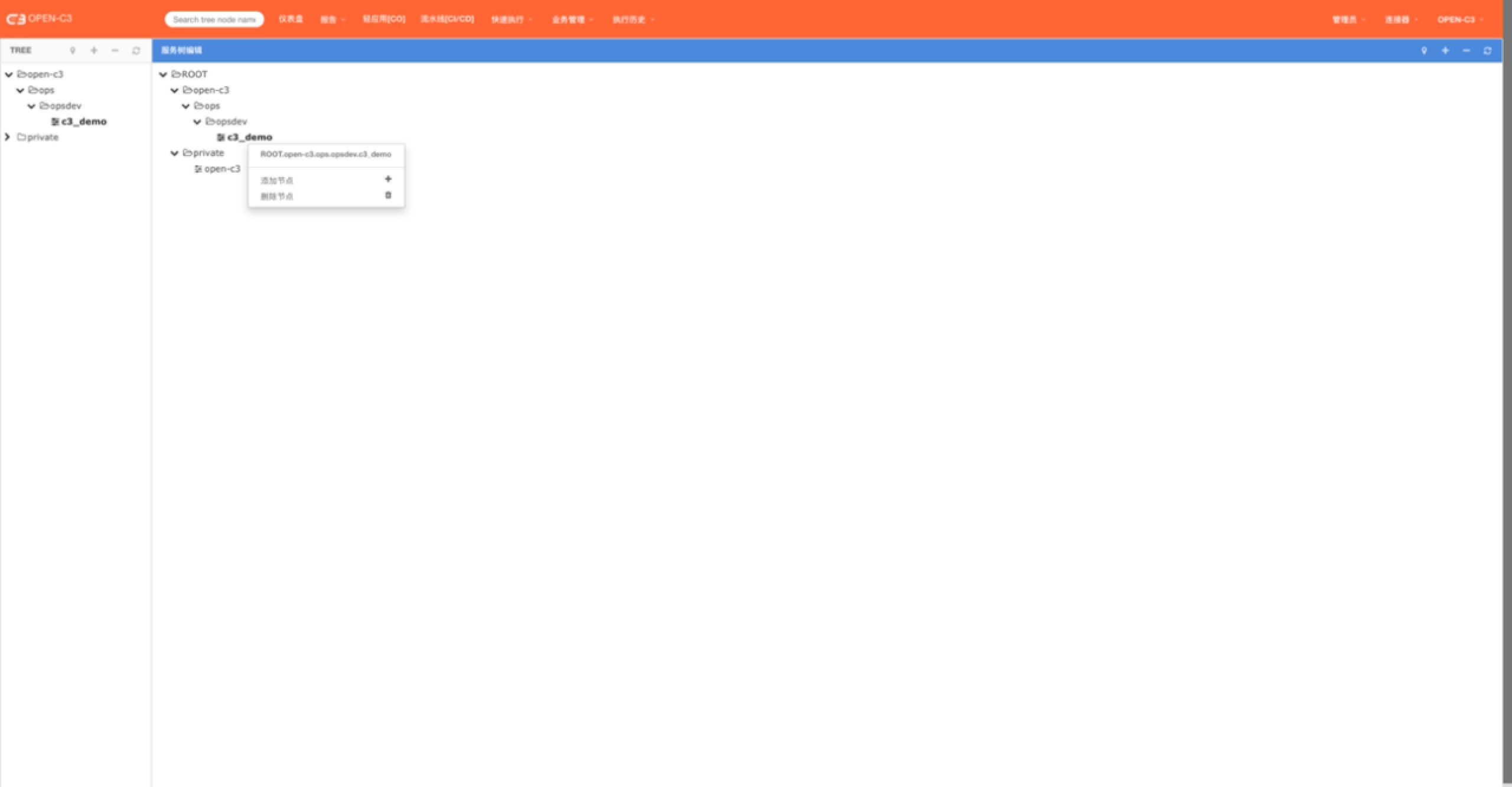 OPEN-C3是一个完全独立的系统,内置了服务树节点管理,如果节点管理已经通过连接器对接到其他平台(如:聚云立方)可以跳过该文档。