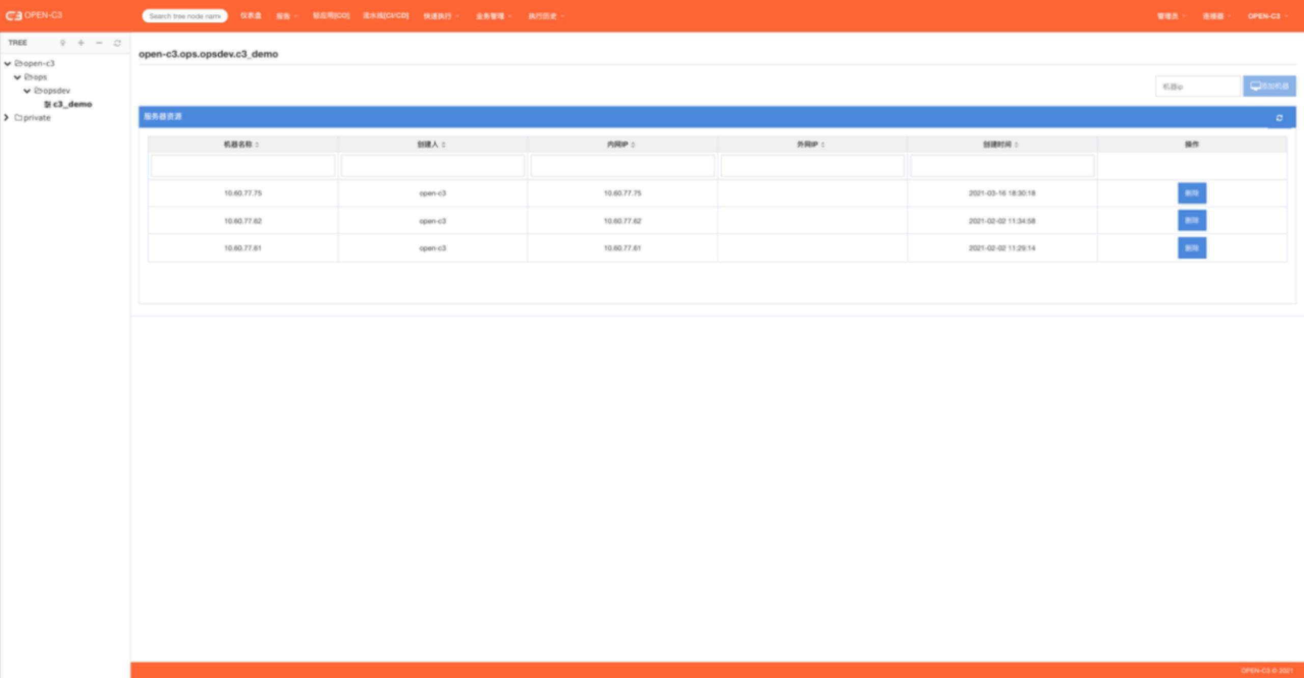 在高集成的环境中,服务树资源管理都会进行外部对接,所以OPEN-C3内置的服务树资源管理只保留了极简的功能,直接填写机器IP添加即可。【只保留了IP一个字段。】